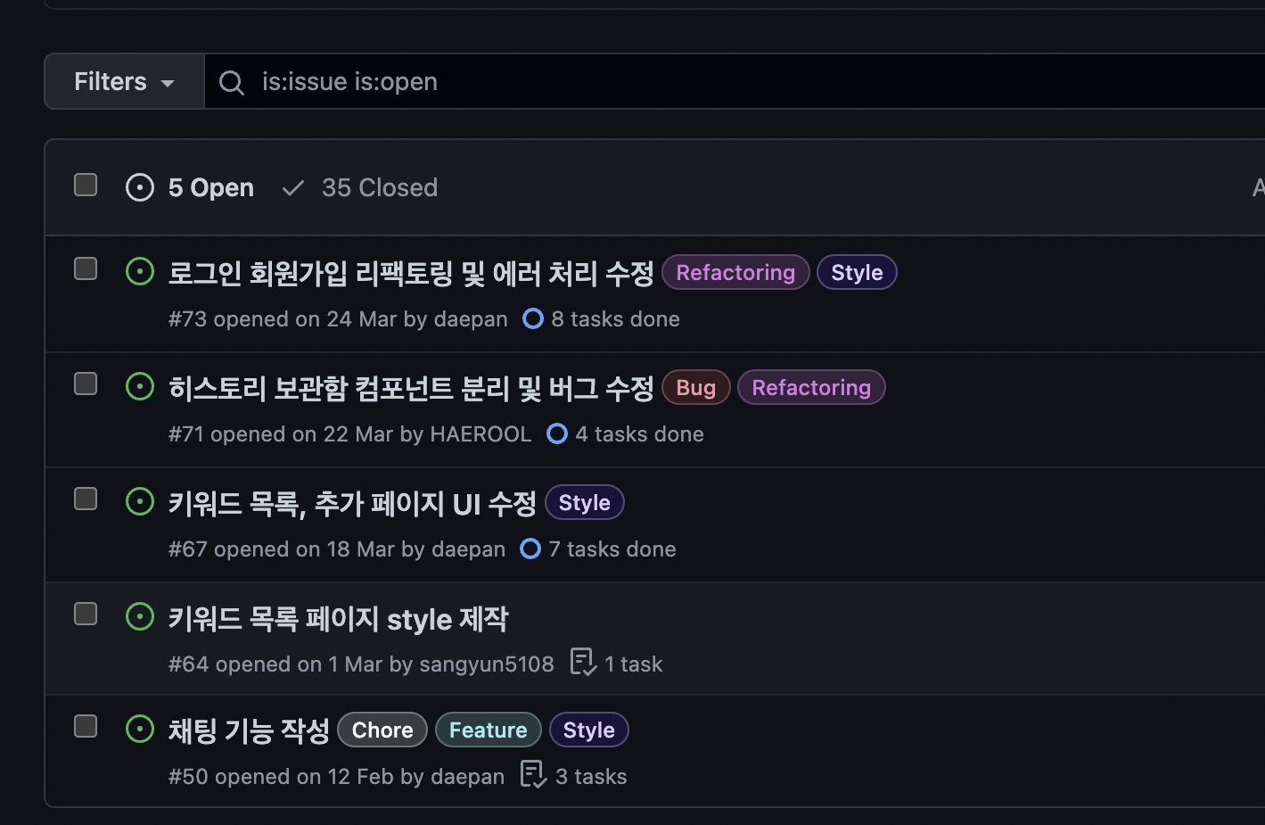 업무분할된 상황을 모두가 한눈에 파악하고 서로의 영역을 침범하지 않기 위해 issue를 통한 업무를 분할하는 방법을 사용하였습니다.